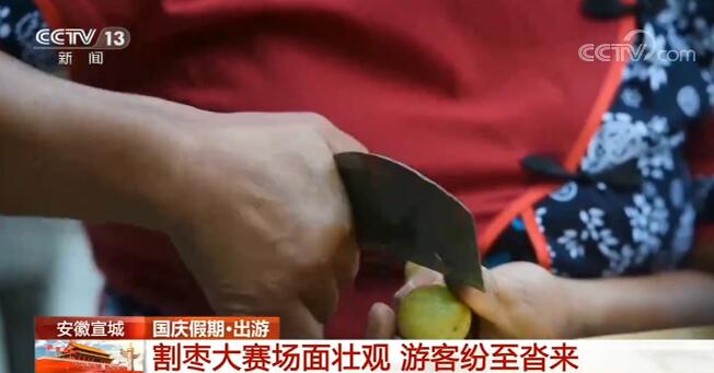 央视网消息:金秋十月也是大枣成熟的季节。在安徽宣城水东古镇,当地产出的蜜枣软糯甜美。这种甜美的蜜枣需要在青枣上用刀子手工割出32道裂口,以便在熬制的过程中让蜜糖充分渗入,这个复杂的过程也考验着割枣工的技艺。昨天(10月2日),当地就举办了这样一场割枣大赛,吸引了众多游客前来观看。