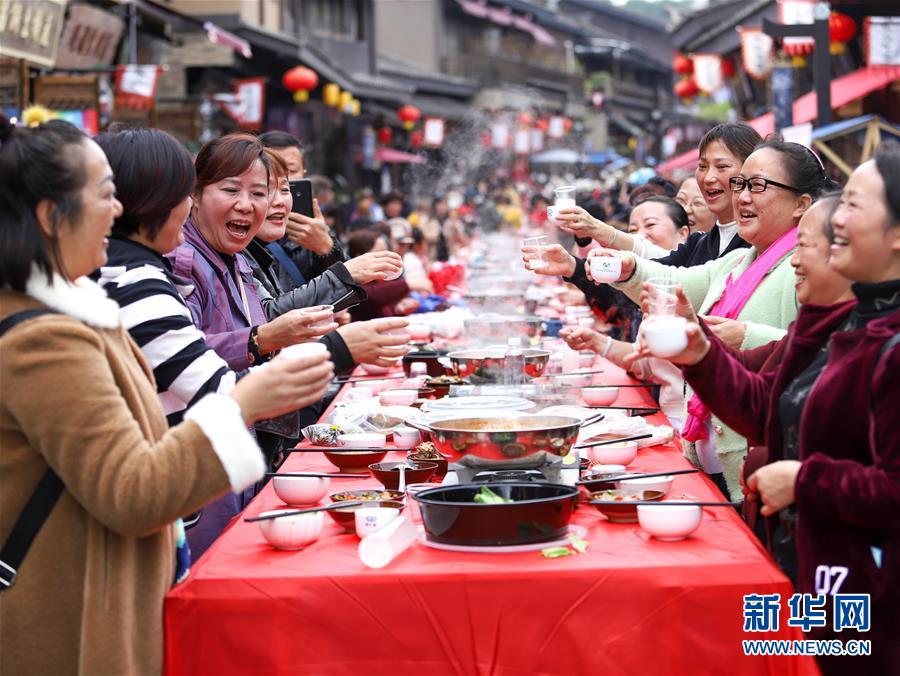10月18日,游客在贵州省丹寨县万达小镇吃新节长桌宴上品尝佳肴。 当日,贵州省黔东南苗族侗族自治州丹寨县万达小镇举办苗族吃新节体验活动。当地苗族同胞跳芦笙舞、品长桌宴,并邀请游客参与其中,大家在欢声笑语中乐享金秋。 新华社发(陆德华 摄)