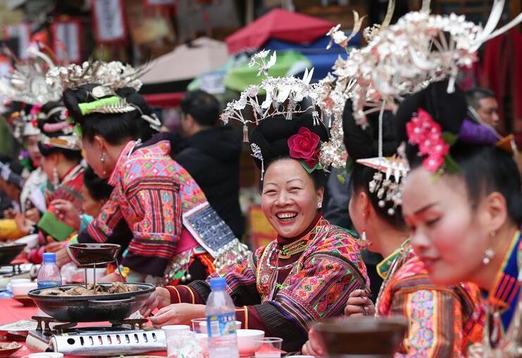 10月18日,苗族群众在贵州省丹寨县万达小镇吃新节长桌宴上品尝佳肴。 当日,贵州省黔东南苗族侗族自治州丹寨县万达小镇举办苗族吃新节体验活动。当地苗族同胞跳芦笙舞、品长桌宴,并邀请游客参与其中,大家在欢声笑语中乐享金秋。