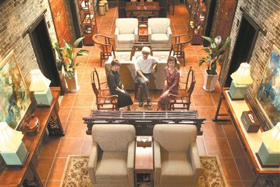 源汀的三位主人韩冲、梁雨、杨少屏坐在民宿客厅之中,客厅的桌椅、沙发、花盆等家具都是精美收藏品,传统而别致。