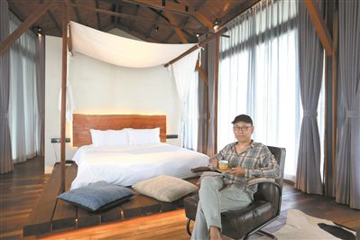 喜临院主人高宇坐在民宿房间里,房间内的家具用品都是他精心挑选的。