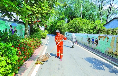 海南陵水县光坡镇大艾园保洁员董昌海正在维护村庄的道路卫生。陈思国摄/光明图片