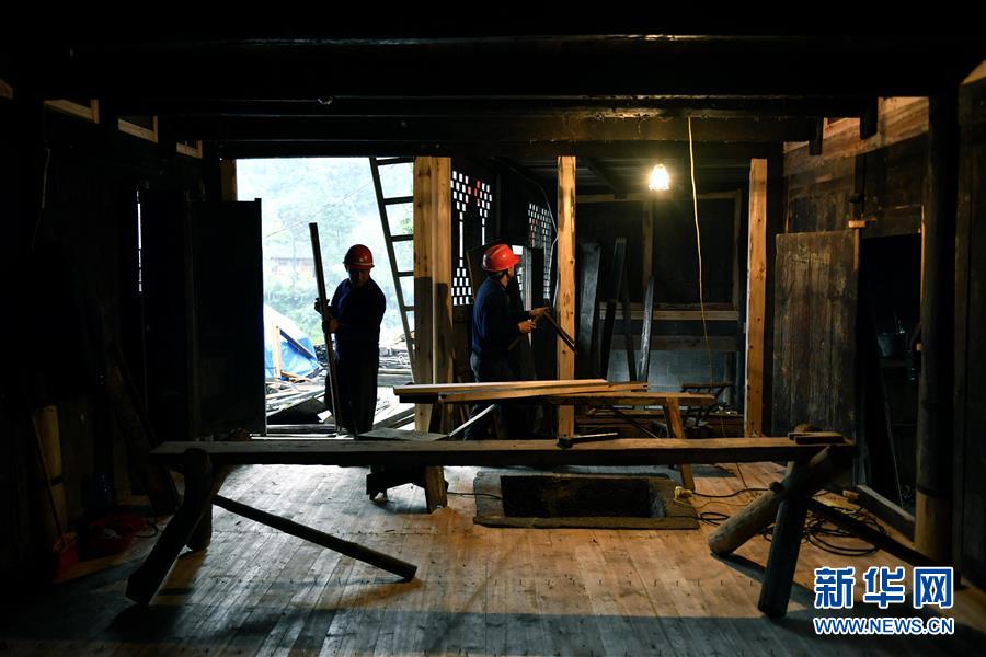 9月25日,木工在彭家寨古吊脚楼里进行修缮施工。 新华社发(宋文 摄)