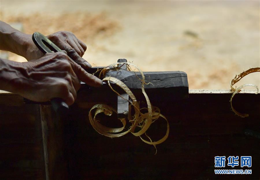 9月25日,一名木工在彭家寨古吊脚楼里用刨子刨木板。 新华社发(宋文 摄)