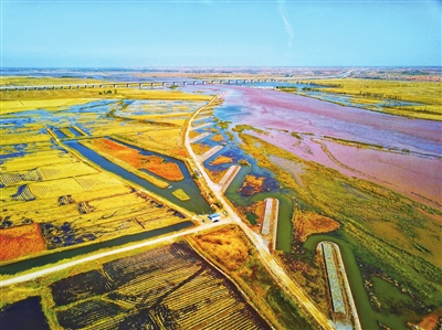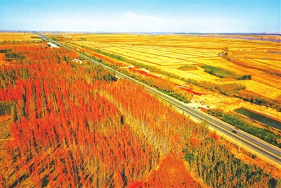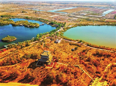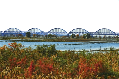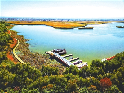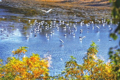 从高空看去,成片的湿地水质清澈,与黄河水“泾渭分明”。红嘴鸥与白鹭在河滩上悠闲地小憩。被秋霜打过的树叶泛起明亮的黄色、红色,将滨河大道装扮得绚丽多彩,时而有路人拿出手机留下这最好的秋景。