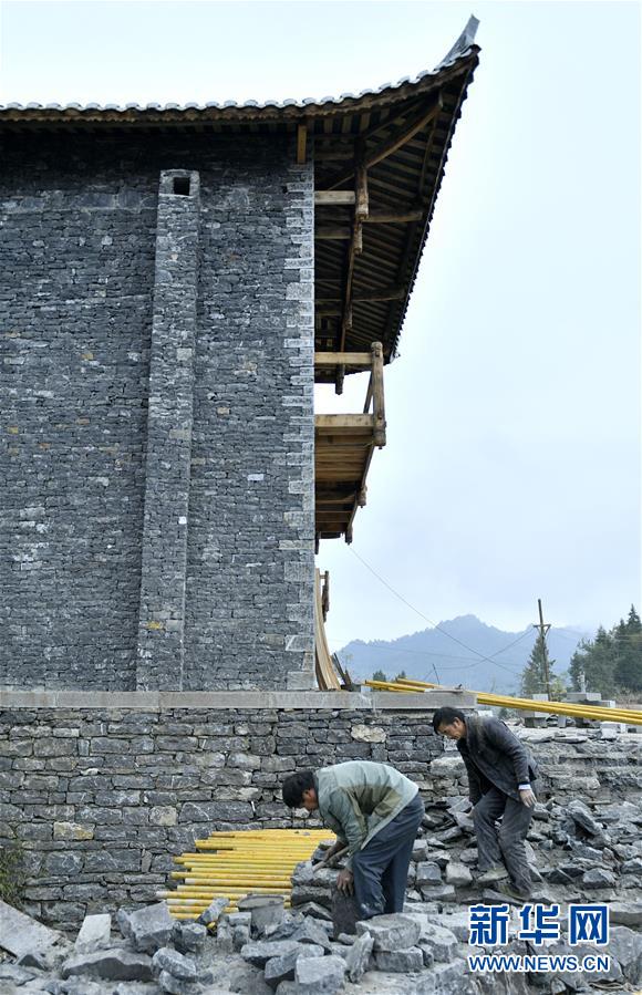 10月24日,在湖北省宣恩县椒园镇黄坪村,工人在一栋基本建成的“石房子”吊脚楼旁施工。