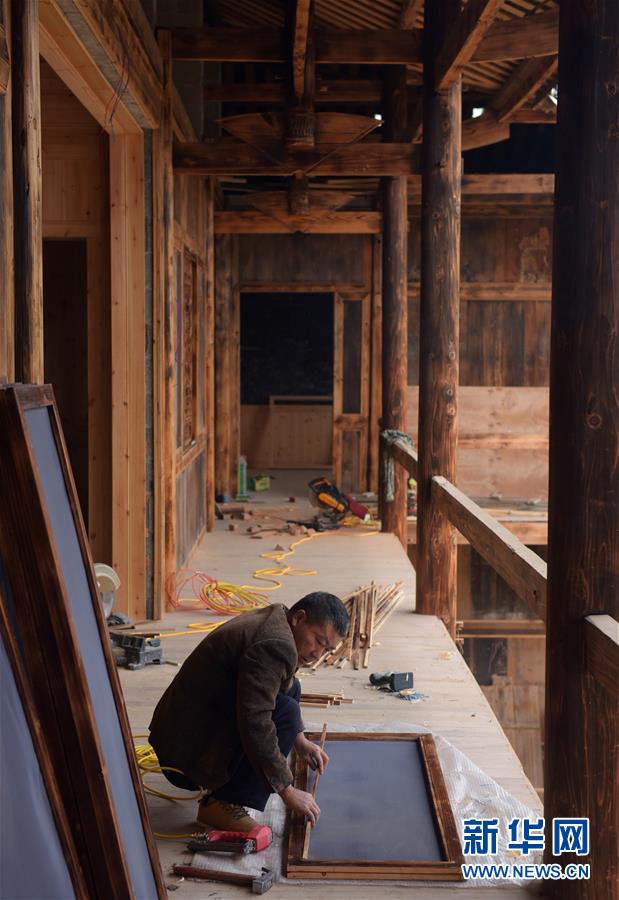 10月24日,工人在湖北省宣恩县椒园镇黄坪村修建的“石房子”吊脚楼里准备安装窗户。