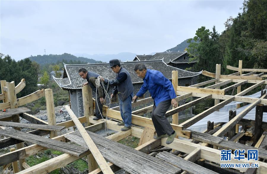 10月24日,在湖北省宣恩县椒园镇黄坪村,工人正在用木头搭建修“石房子”吊脚楼的骨架。