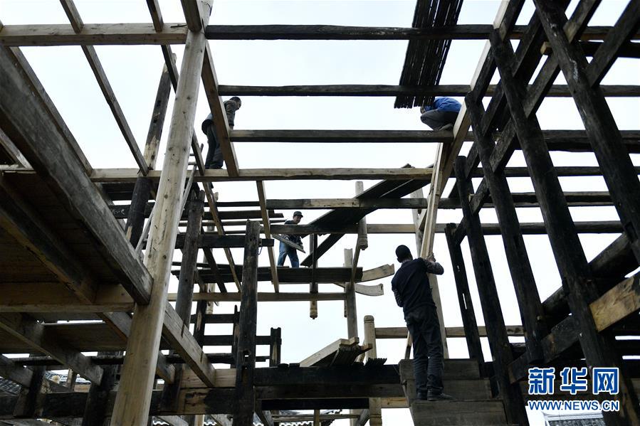 10月24日,在湖北省宣恩县椒园镇黄坪村,工人正在用木头搭建修“石房子”吊脚楼的骨架。
