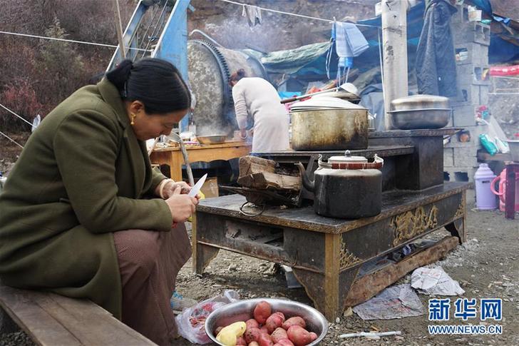 在四川甘孜藏族自治州白玉县金沙乡安置点,八吉村村民在准备午饭(11月17日摄)。新华社记者 张海磊 摄