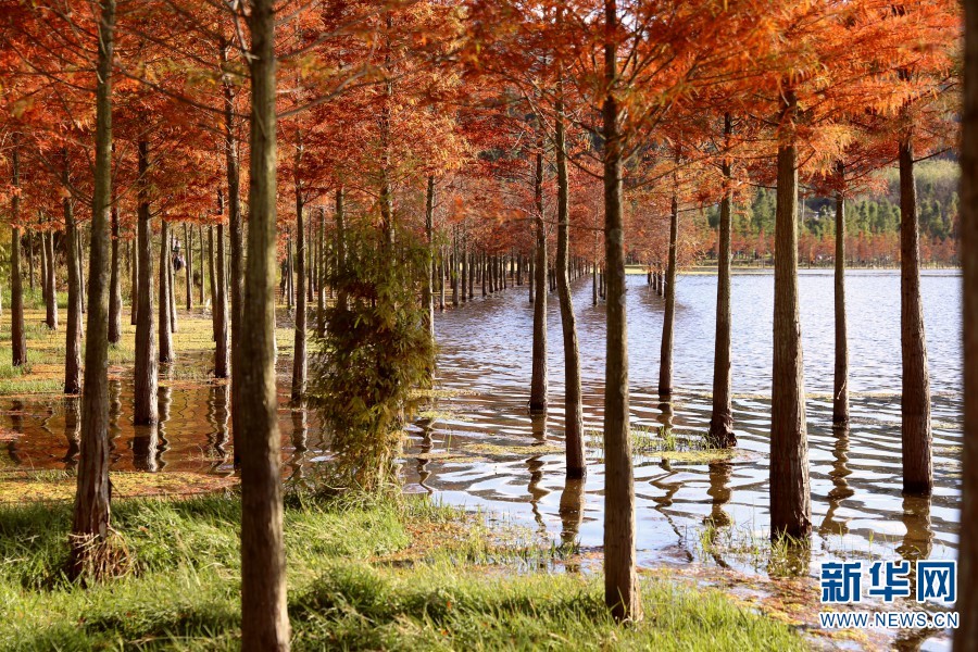 位于昆明棋盘山脚下的三家村水库,水杉已经变成红色,形成“树在水中生,水在树中流”的绝美景观。(新华网 赵普凡 丁凝 摄影报道)