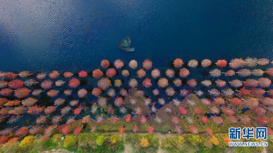 航拍三家村水库红色的水杉