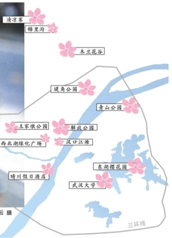 最佳赏花点:从樱花坡延伸至八匹马、湿地大湖区域;公园管理处的涵秋桥道路两旁和中华名塔园。