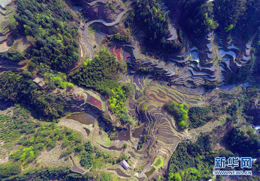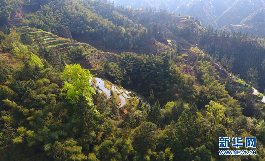 这是广西融水苗族自治县杆洞乡党鸠村的田园春色(3月29日无人机拍摄)。新华社记者 黄孝邦 摄