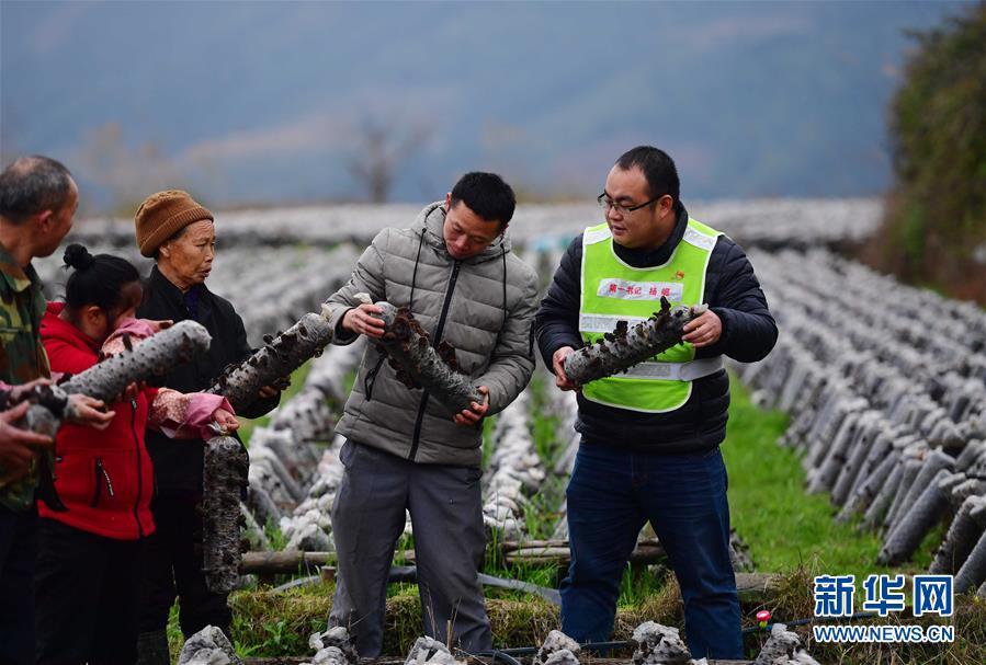 在广西融水苗族自治县大浪镇上里村木耳种植基地,驻村第一书记杨崛(右一)和社员们在查看木耳的生长情况(2月28日摄)。新华社记者 黄孝邦 摄
