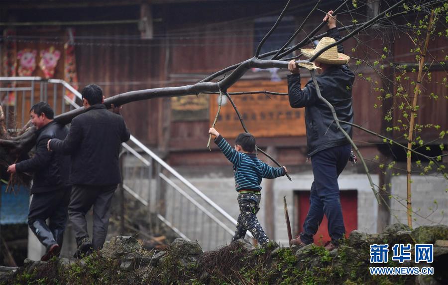 这是黔桂乌英苗寨的群众在抬树苗,准备用来美化居住环境(3月16日摄)。新华社记者 黄孝邦 摄