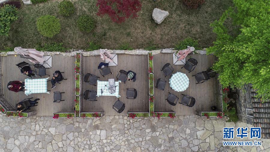 4月13日,游客在湖北省远安县花林寺镇龙凤村的民宿小院休息(无人机拍摄)。湖北省远安县花林寺镇龙凤村拥有田园诗画一般的自然风光,但曾经是一个贫困村。近年来,随着美丽乡村建设及远安县农业发展项目的大力推进,得到一系列政策扶持的龙凤村依托乡村现有资源,在保留古村特色的基础上,打造精品休闲民宿旅游村,使乡村休闲旅游成为村民脱贫致富的支柱产业。 新华社记者 杜华举 摄