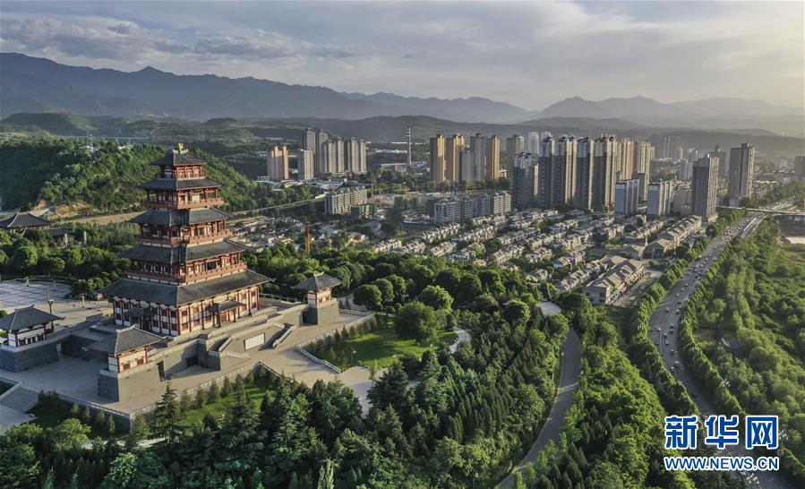这是宝鸡市石鼓阁(5月22日无人机拍摄)。
