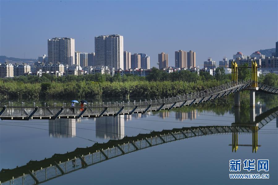 5月25日,市民通过渭河上的吊桥。