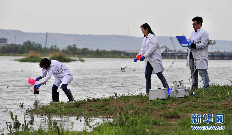 宝鸡市环境监测中心站工作人员在渭河采集水样,监测水质(4月9日摄)。