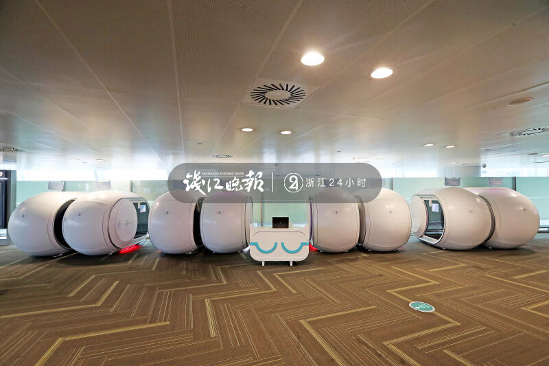 环顾一圈,胶囊休息舱就在下电梯后的最右边,一共8个,纯白色的外观,圆鼓鼓的造型,确实很像胶囊。