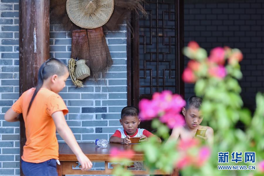 三名男孩在江西南昌安义县水南赣派小吃街上休闲纳凉(8月8日摄)。新华社记者 李芒茫 摄