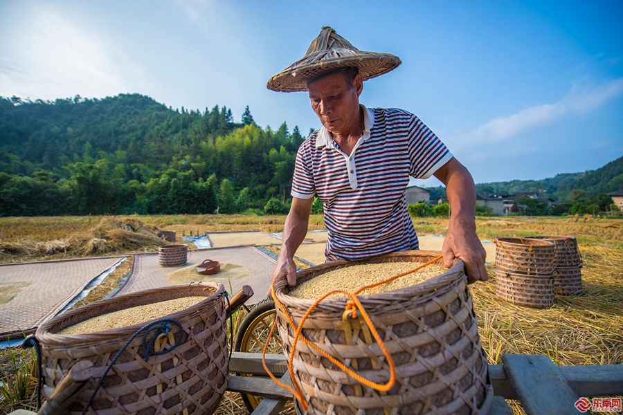 经过一天的晾晒后,当地居民把晾晒干的稻谷收集起来。游斐渊 摄