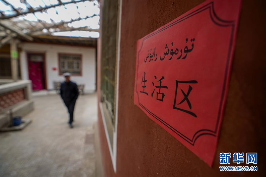 在新疆和田地区和田县布扎克乡托乎拉村村民麦吐肉孜·买买提家中,写有“生活区”的标识贴在家中显要位置上(11月24日摄)。新华社记者 赵戈 摄