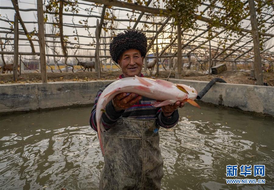 在新疆和田地区墨玉县萨依巴格乡渠首村,村民阿卜杜克热木·图尔地在自家鱼塘里展示刚抓到的鲜鱼(11月21日摄)。新华社记者 赵戈 摄