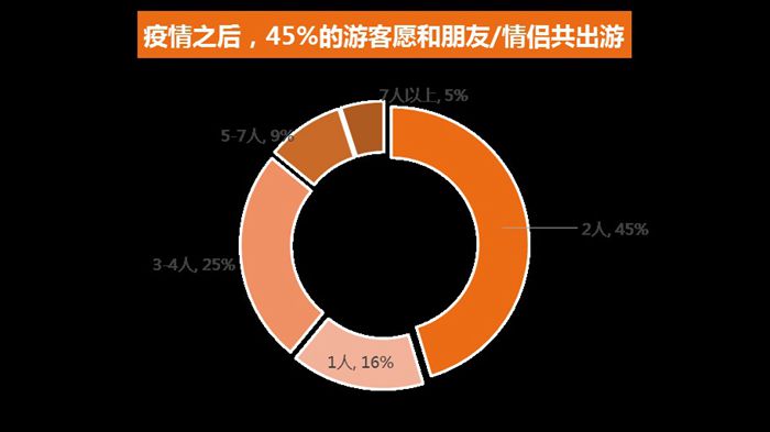 疫情结束后,你愿携手与谁共出游?途家平台数据显示,45%的游客愿意在疫情结束后与朋友或情侣共同出游,3-4人的家庭出游占比25%。数据还显示,目前浏览和预订的游客中,有近40%的游客选择了周边游或省内游,这一比例明显高于去年同期。
