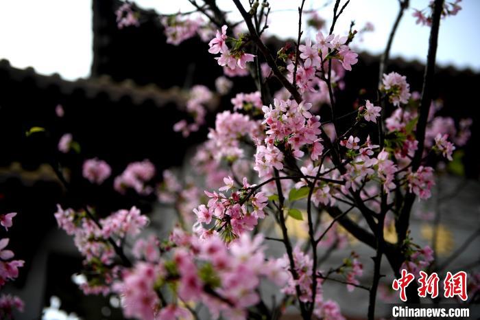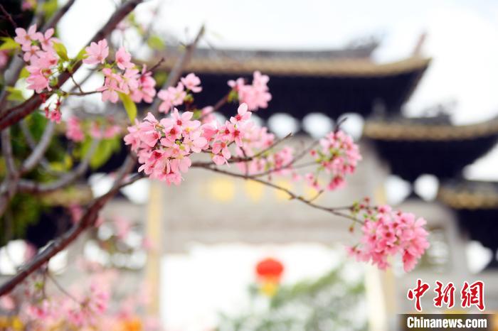 在古建筑的背景前,樱花灿烂绽放。 姬东 摄