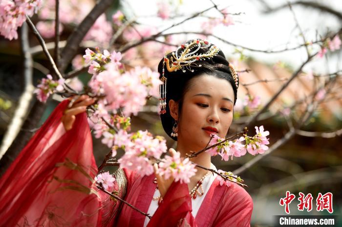 身穿汉服的女子细品花香。 姬东 摄