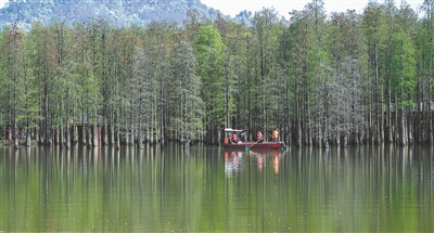 图为保洁工作人员正在乘船清理青山湖水上森林区域湖面的漂浮物。据了解,保洁人员每天都要乘船巡湖,保障湖区环境卫生。
