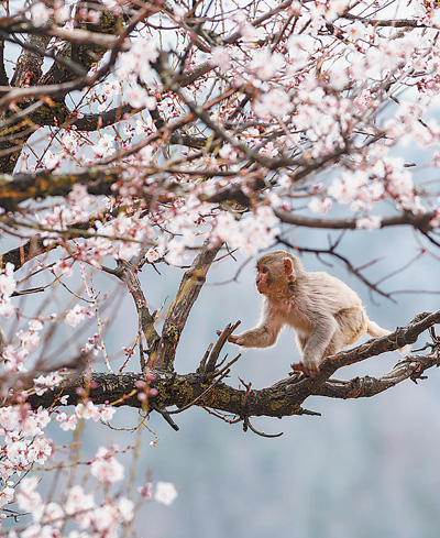 林芝市工布江达县,一只猴子坐在开花的野桃树上。