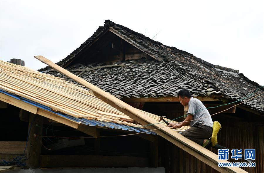 贵州省从江县加榜乡党扭村村民在整治吊脚楼风貌(4月16日摄)。 贵州省从江县把人居环境整治作为脱贫攻坚工作的一项重要举措来抓,对乡村规划范围内长期无人居住的危房、废弃禾仓、棚圈、柴草房和房前屋后的残垣断壁等进行清理整治,进行复垦复绿,同时开展农户卫生和村寨环境整治,做到乡村环境干净、卫生、整洁,扮靓美丽乡村。 新华社记者 杨文斌 摄