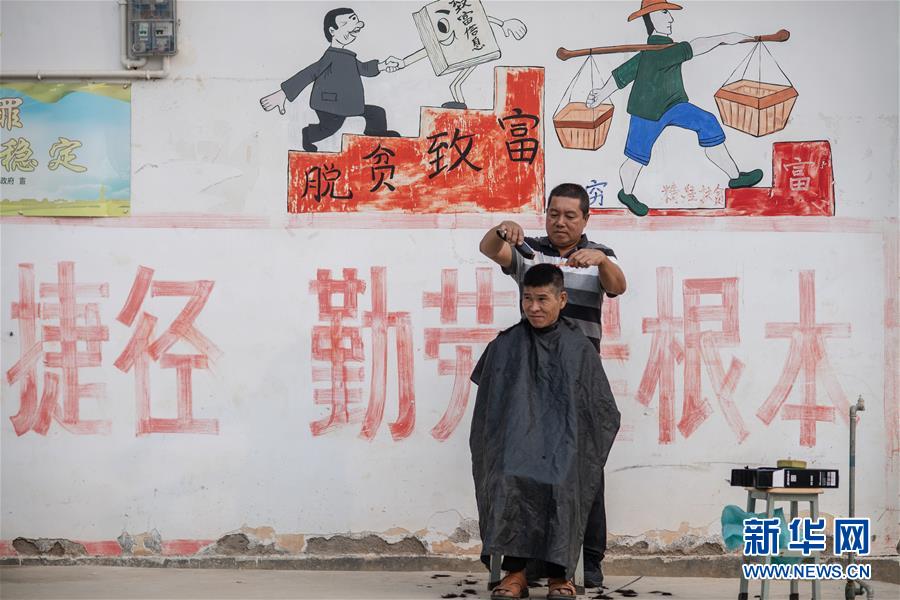 4月12日,在云南省勐海县布朗山乡曼囡村曼班三队,扶贫工作组长罗志华在给村民理发。 新华社记者 胡超 摄