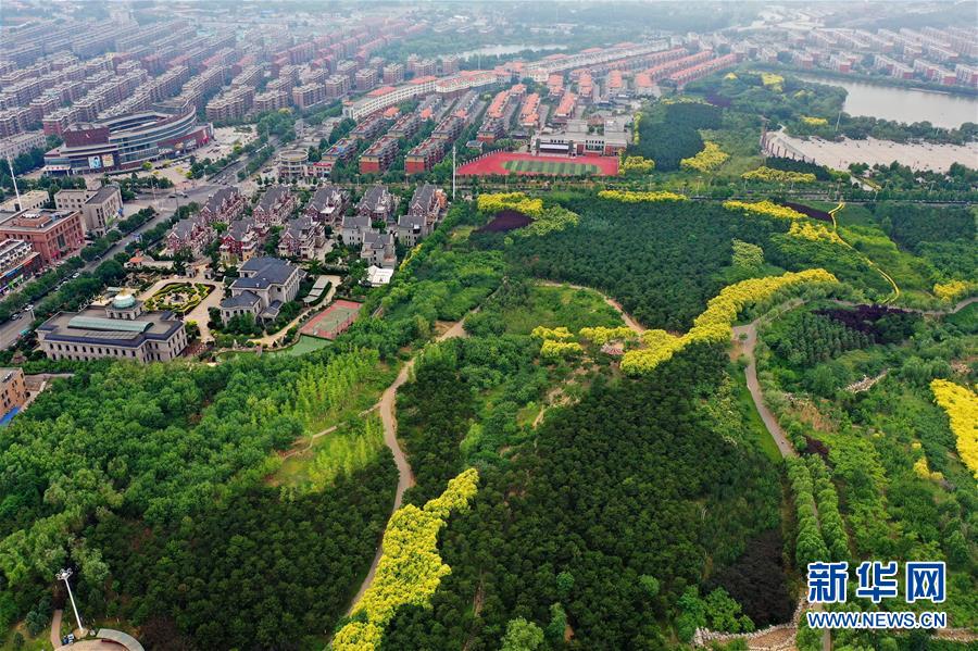 这是6月9日拍摄的河北省唐山市古冶区由采煤沉陷区改造而成的金山森林公园(无人机照片)。