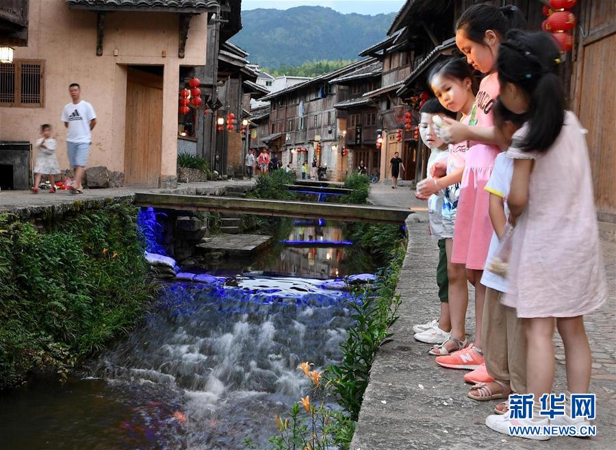 7月3日,小朋友在浦源村鲤鱼溪畔喂食溪中的鲤鱼。 新华社记者 姜克红 摄