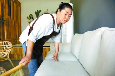 周末中午,冬奥小镇2号院的客人刚刚退房,保洁员赵金花利落地整理好短袖、围裙,忙碌起来,为迎接下午新一拨儿客人做准备。