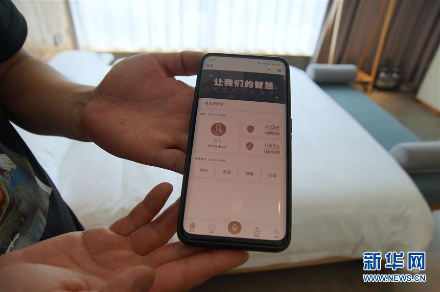 在河南省洛阳市栾川县重渡沟,民宿店主刘亮展示手机上的客房智能控制程序(7月8日摄)。新华社记者 李文哲 摄