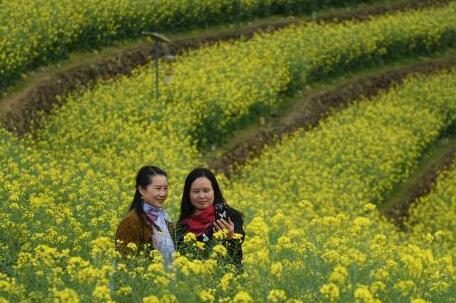 浙江杭州百亩梯田油菜花绽放吸引游人
