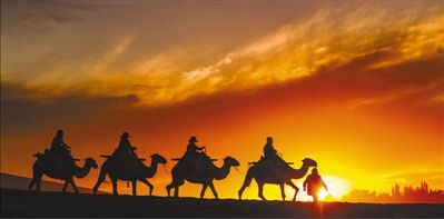 敦煌深厚的文化底蕴和壮丽的自然风光吸引了众多游客前来观光游览。图为6月17日,夕阳下的游客乘坐骆驼欣赏敦煌大漠风光。
