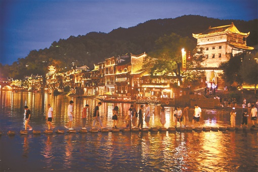 凤凰古城灯光璀璨,美轮美奂,吊脚楼倒影在水中,色彩斑斓,格外美丽,游客乘船徜徉古城,如在画中游。