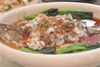 这款葱油淋桂花鱼到底有哪些烹制“心经”?据厨师陈文全透露,将新鲜桂花鱼处理干净,片成无骨无刺的薄片,用调好的味料腌制一番,迅速过油,鱼片特别嫩滑。剩下的鱼头、鱼骨蒸熟后,摆放在鱼片两端“还原”成鱼状,淋上薄薄一层葱花豉油,碧绿的葱碎和青红椒圈相互点缀,尤为惹人食欲。“腌制和过油则是最关键的。”陈文全强调,鱼肉软滑程度都取决于此,这就需要拿捏好“手上功夫”。