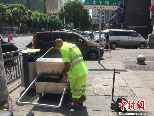 环卫工人高温下工作。 鲁毅 摄