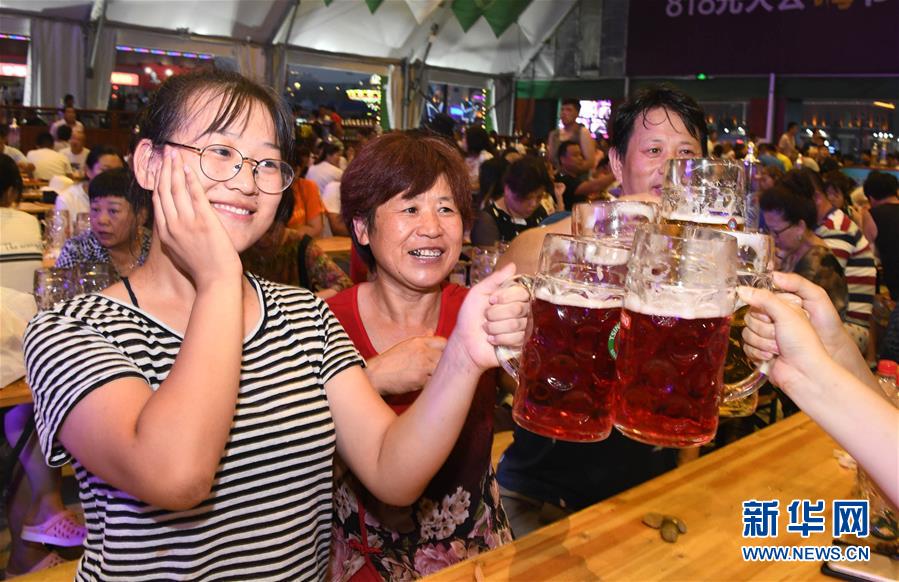 7月20日,顾客在青岛西海岸新区金沙滩啤酒城举杯庆祝。