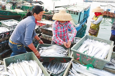 乌场港码头忙着出售渔获的渔民。海南日报记者 王凯 摄