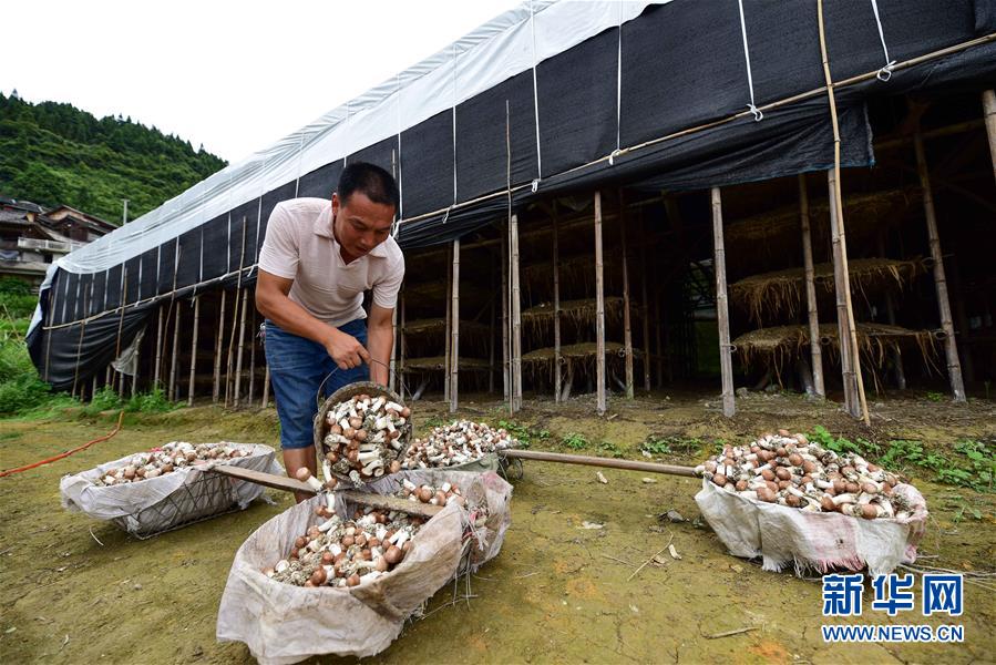 7月25日,贵州省丹寨县排调镇也改村村民在搬运刚刚采摘的姬松茸。 盛夏时节,贵州省黔东南苗族侗族自治州丹寨县排调镇也改村种植的大棚姬松茸迎来采收季,大棚内外一派繁忙景象。 在当地政府和帮扶单位的帮助下,也改村从2017年开始种植具有食用和药用价值的姬松茸,有效带动了种植户脱贫致富。 新华社发(杨武魁 摄)