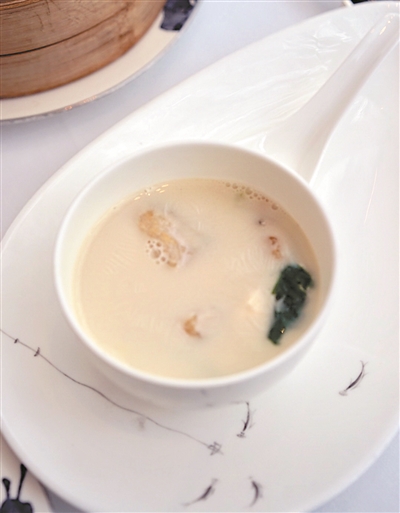 粤菜精粹在招牌菜“白雪藏金龙”和“香茜豆腐斑腩汤”中体现得淋漓尽致。孙师傅选用两斤重的游水美国红龙虾,取其肉低温走油后烹煮。汤底乃鸡汤加金华火腿、南瓜、海胆等熬制4小时而成。铺底一层蛋白加上新鲜海胆,叫人惊喜不已,是“传统菜之中见创新”的典型例子。香茜豆腐斑腩汤,如凝脂温润,暖意清柔,它虽是鱼汤,却绝无分毫的腥味。熬制此汤的选料讲究,一斤半的新鲜老虎斑,加葱、胡椒粒,用矿泉水大火熬煮,熬至汤色乳白。精心制作的手工豆腐与鱼汤浑然天成。