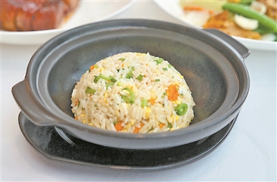 此时是蟹之季,孙师傅用蟹做了两道粤式佳肴。蟹黄红袍大花胶是女士们喜爱的“明星”菜肴,师傅采用鲈鱼花胶制作,特别挑选厚实而富有胶质的公肚。汤底乃是用时令蟹壳熬制,加上龙虾头壳、红萝卜、西芹和少许姜。花胶饱吸海鲜汤之风味,口口皆是鲜香无比的胶原蛋白;海胆蟹肉炒饭透露着孙师傅传统与创新融合的心思,泰国香米蒸熟以后摊冻,再用大火快炒,加入鲜拆的蟹肉和新鲜大连海胆,香米粒粒饱满而干身,蟹肉与海胆之鲜渗入香米之中,即便是为身材而戒了主食的女士,恐怕也难以抵挡这份诱惑啊。